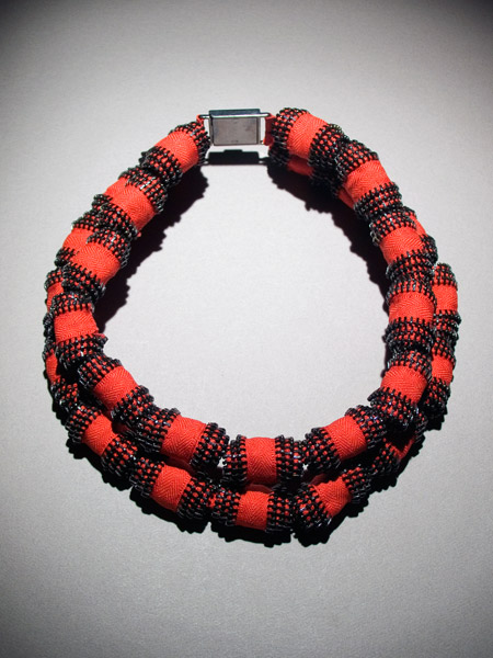 Who said zips can't be beautiful? These amazing necklaces are made by Kate Cusack who is inspired by unusual materials and aims to make them into theatrical accessories. I'm so puzzled at how she manages to contort the zips into these sculptural designs, she clearly has a lot of talent. All of the pieces from her zipper collection are very bold and unusual with brilliant use of shape and texture. I love the contrast between the bright red and the black metal in the first design, any piece of her jewelry would completely transform an outfit.